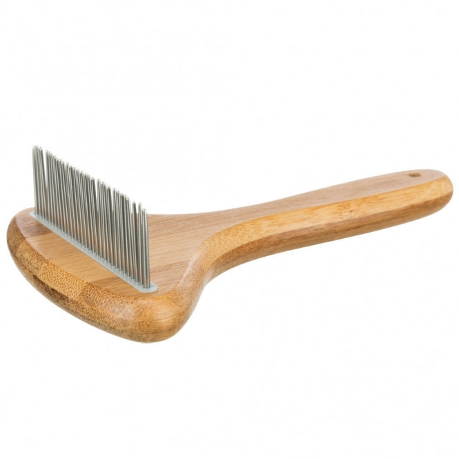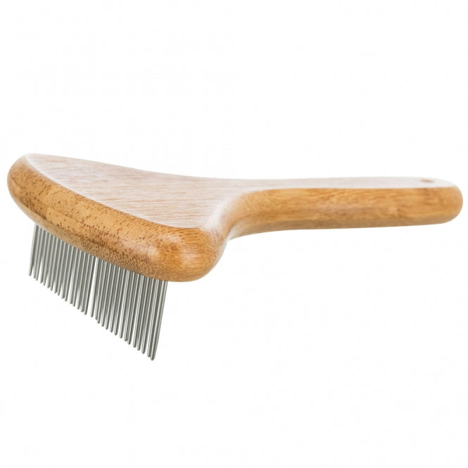 Trixie kortpels-uldfilter af bambus er udviklet til skånsom, men effektiv pleje af kort- og ruhårede pelstyper. De 2,5 cm lange metalzink glider let gennem pelsen og løsner underuld samt løse hår uden at irritere huden. Det hjælper med at forebygge filt og fremmer en sund, blank pels.